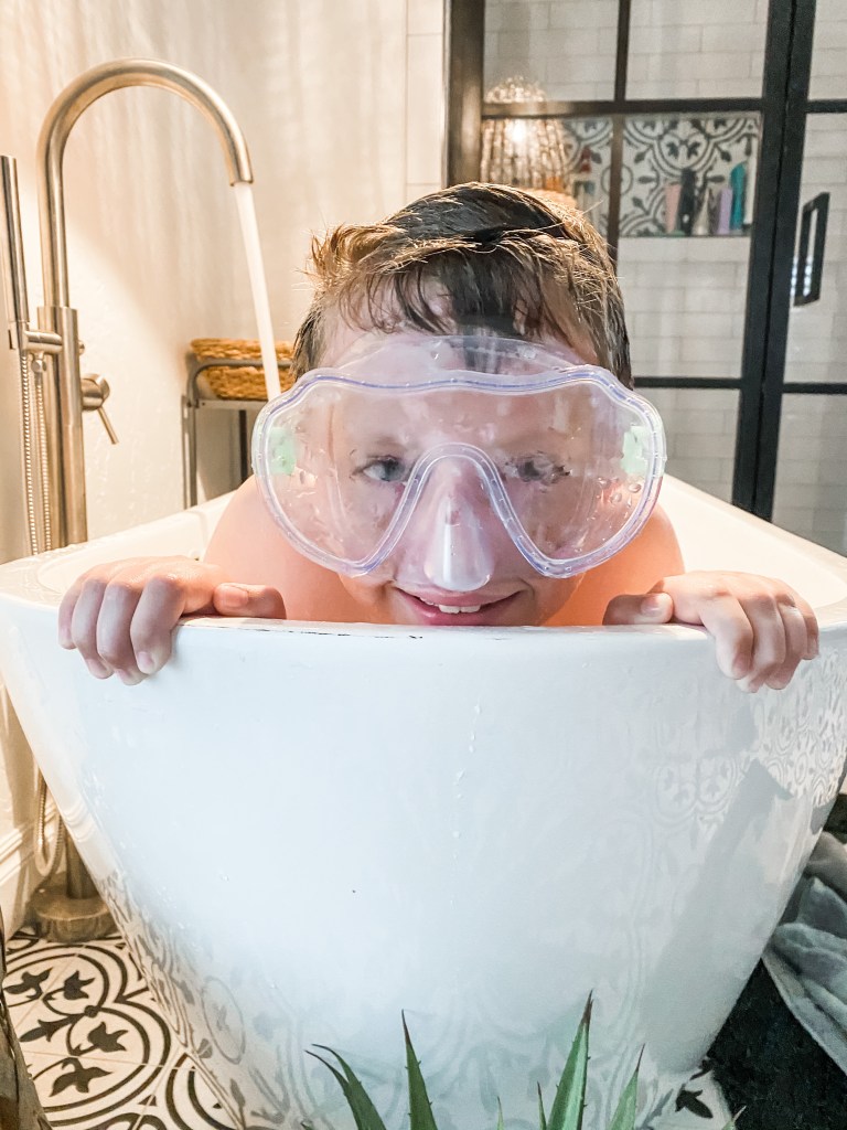 Plus, if you have young kids they will add their scuba goggles & get lost in underwater adventures. We even find ourselves using this space to practice spelling words. I’ll tell my son the word and he will spell it out as loud as he can while under the water. I don’t know about you but that makes me think back to my childhood days.